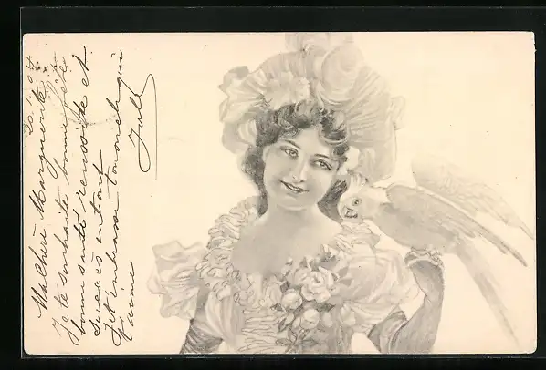 AK Junge Frau mit einem Kakadu, Jugendstil