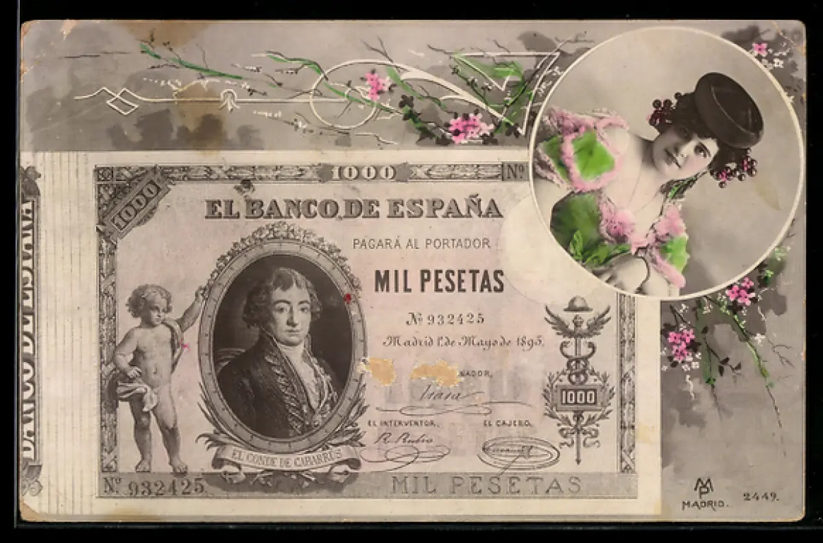 AK Junge Frau mit spanischem Geldschein