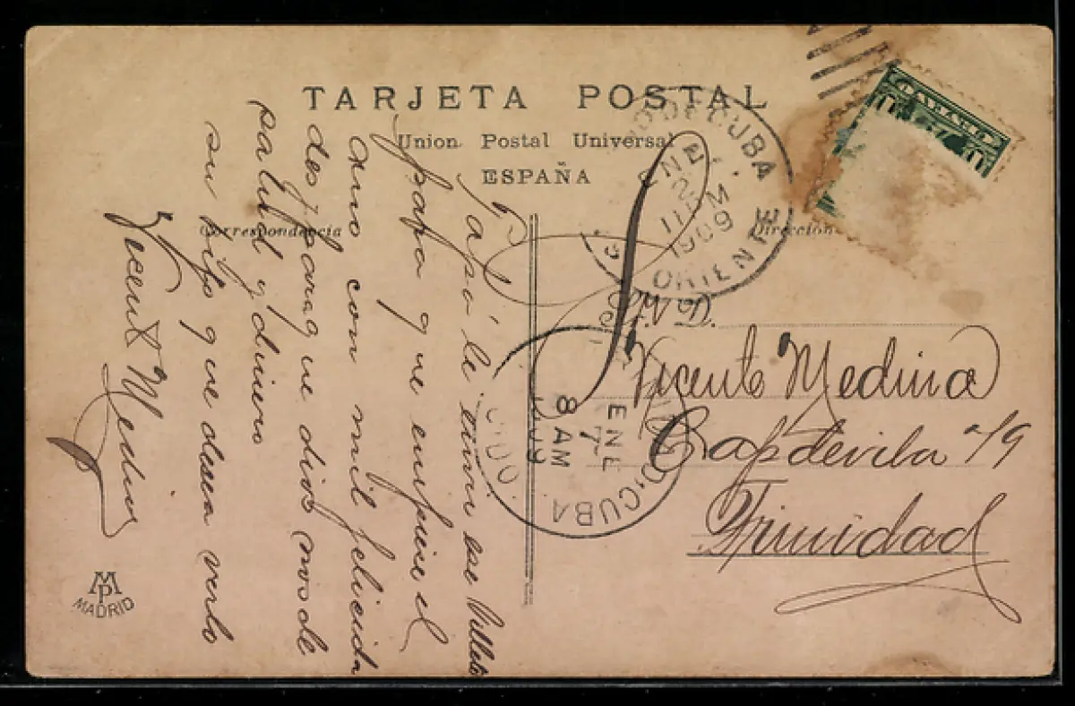 gelaufen 1909, Briefmarke entfernt, rückseitig Oberflächenschaden, Eckknicke re. oben u. li., guter Zustand