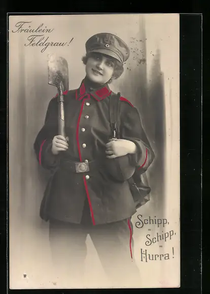 AK Junge Soldatin in Uniform mit Schaufel, Fräulein Feldgrau