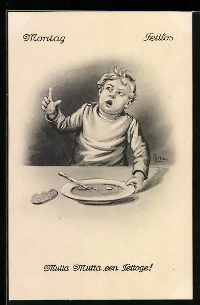 AK Junge entdeckt ein Fettauge in der Suppe, Kriegsnot