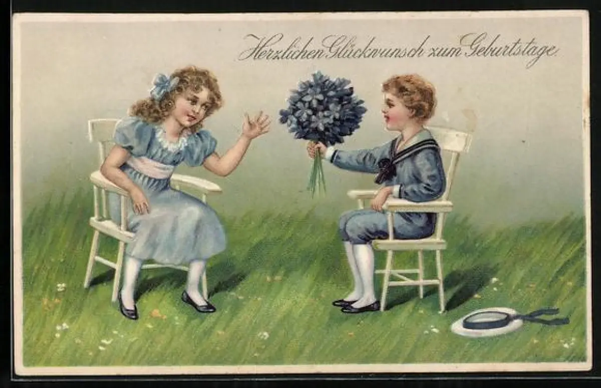 AK Junge gibt Mädchen einen Blumenstrauss zum Geburtstag