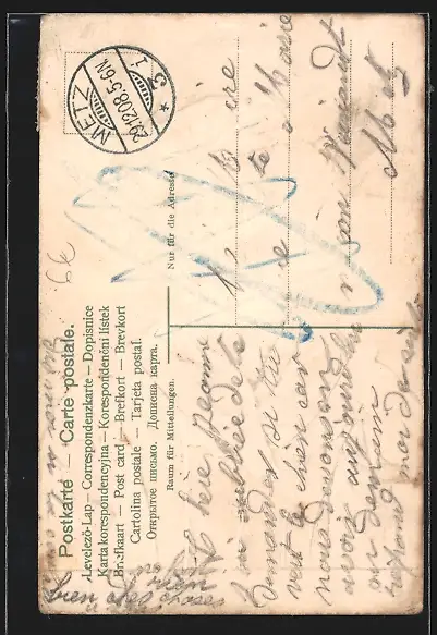 gelaufen 1908, Eckknick oben li., guter Zustand