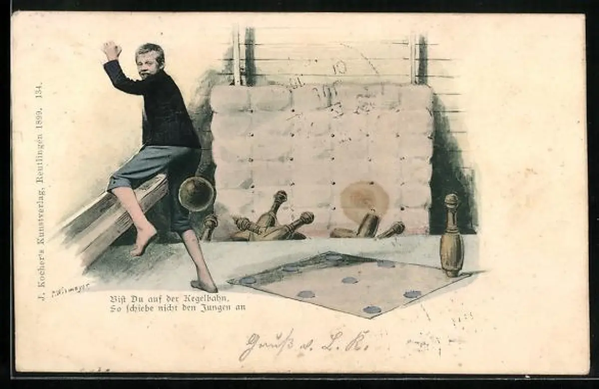 AK Junge in einer Kegelbahn, Bist Du auf der Kegelbahn, so schiebe nicht den Jungen an