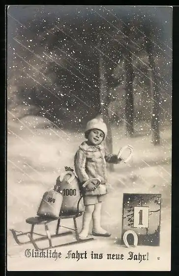 AK Junge mit Geldsäcken auf Schlitten im Schnee, Neujahrsgruss