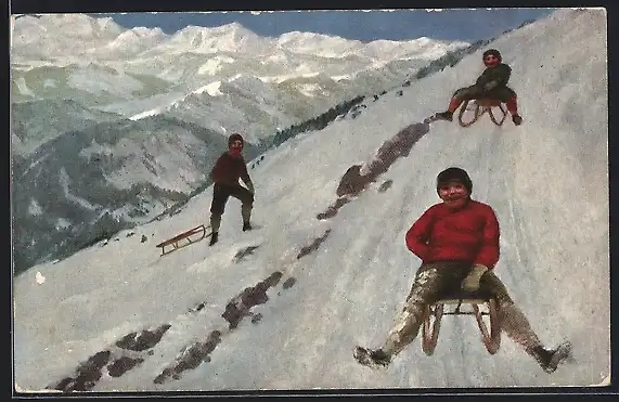 AK Jungen beim Rodeln in den Bergen, Schlitten