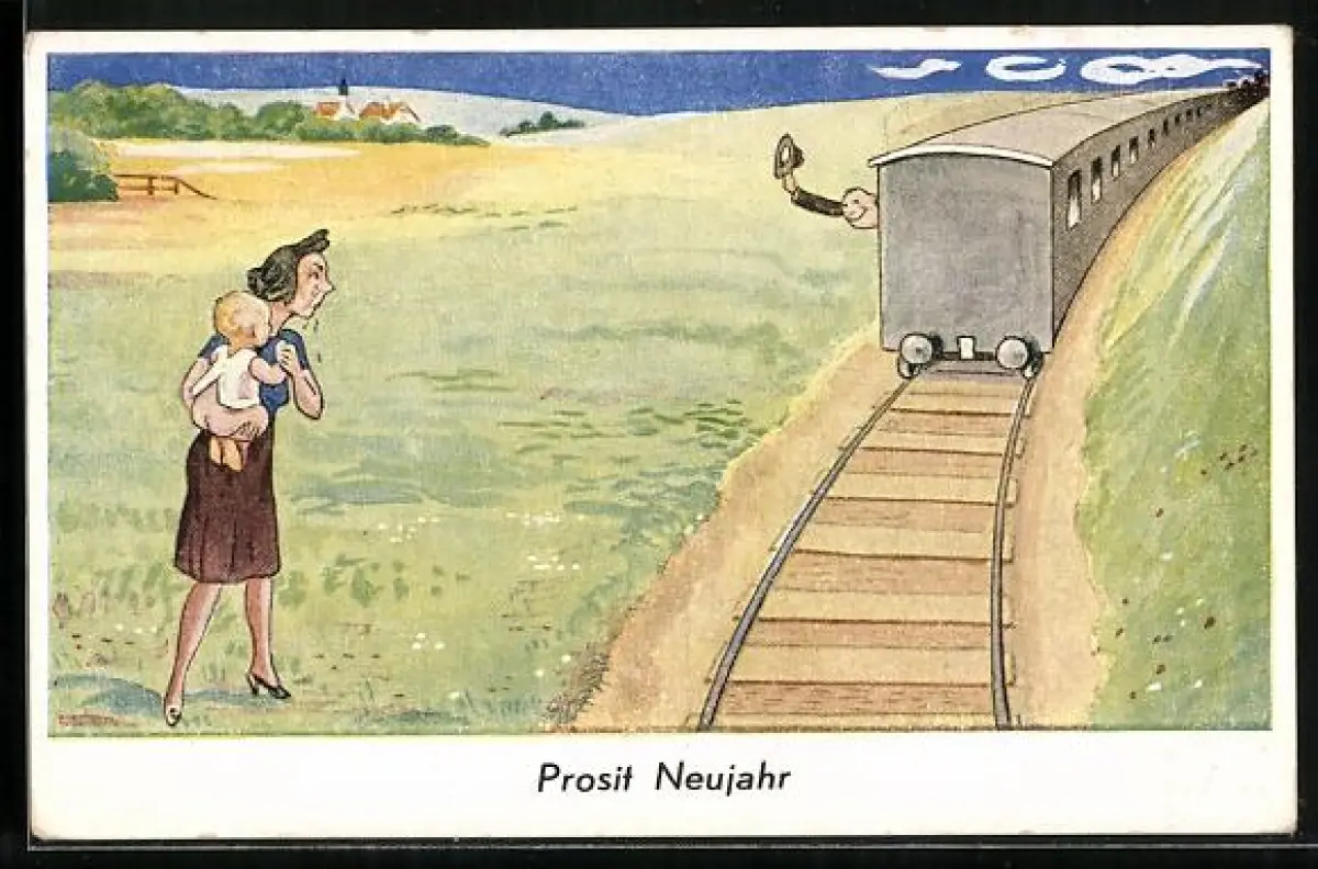 AK Junger Vater verlässt Mädchen und Kind mit der Eisenbahn, Neujahrsgruss