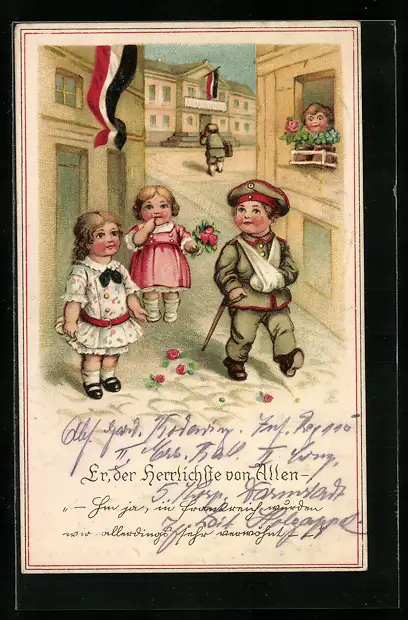 AK Junger verletzer Soldat in Uniform geht durch die Stadt, Kinder Kriegspropaganda