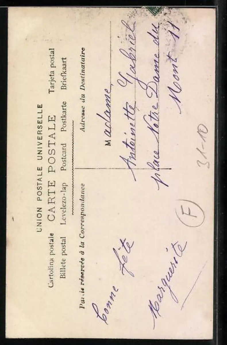 Personenbezogene Daten auf der Rückseite der Karte wurden durch blauen Textmarker unkenntlich gemacht. Die blauen Stellen sind auf die Vorderseite durchgeweicht und wirken sich negativ auf das Postkartenfoto aus