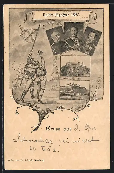 AK Kaisermanöver 1897, Soldaten mit Fahne, Portrait Kaiser Wilhelm II.