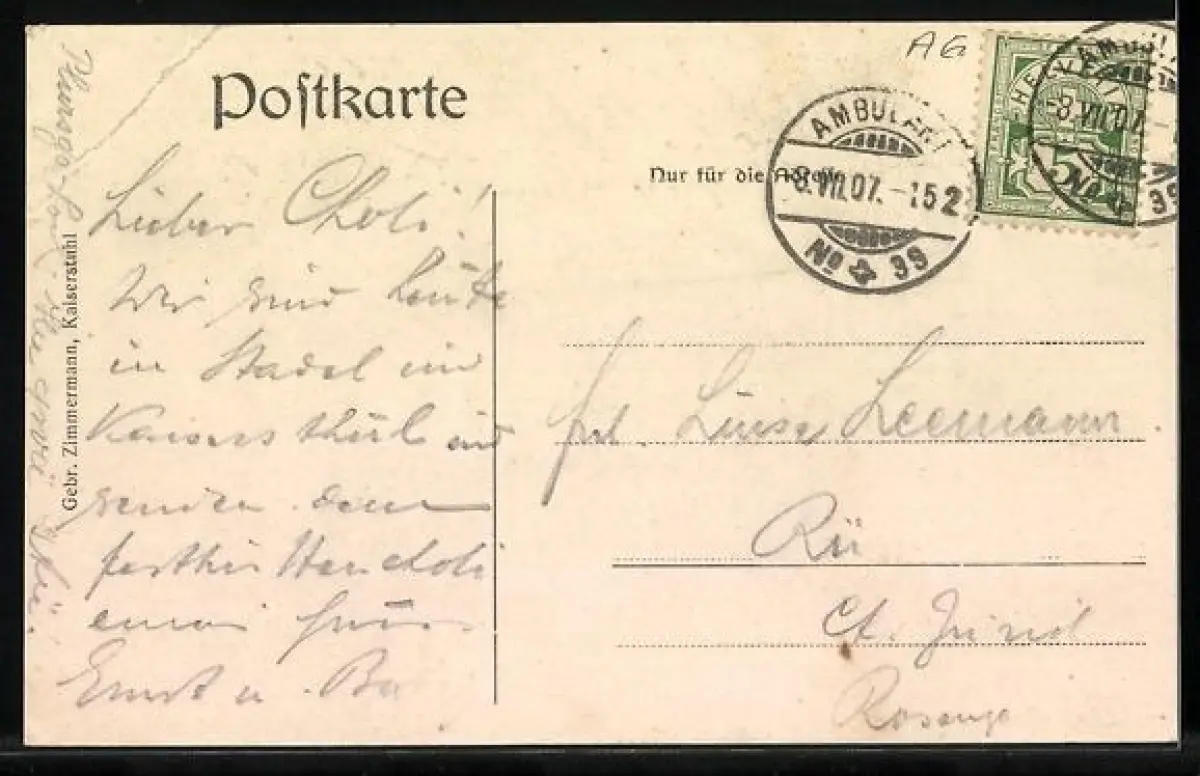 gelaufen 1907, Eckknicke re. oben, guter Zustand