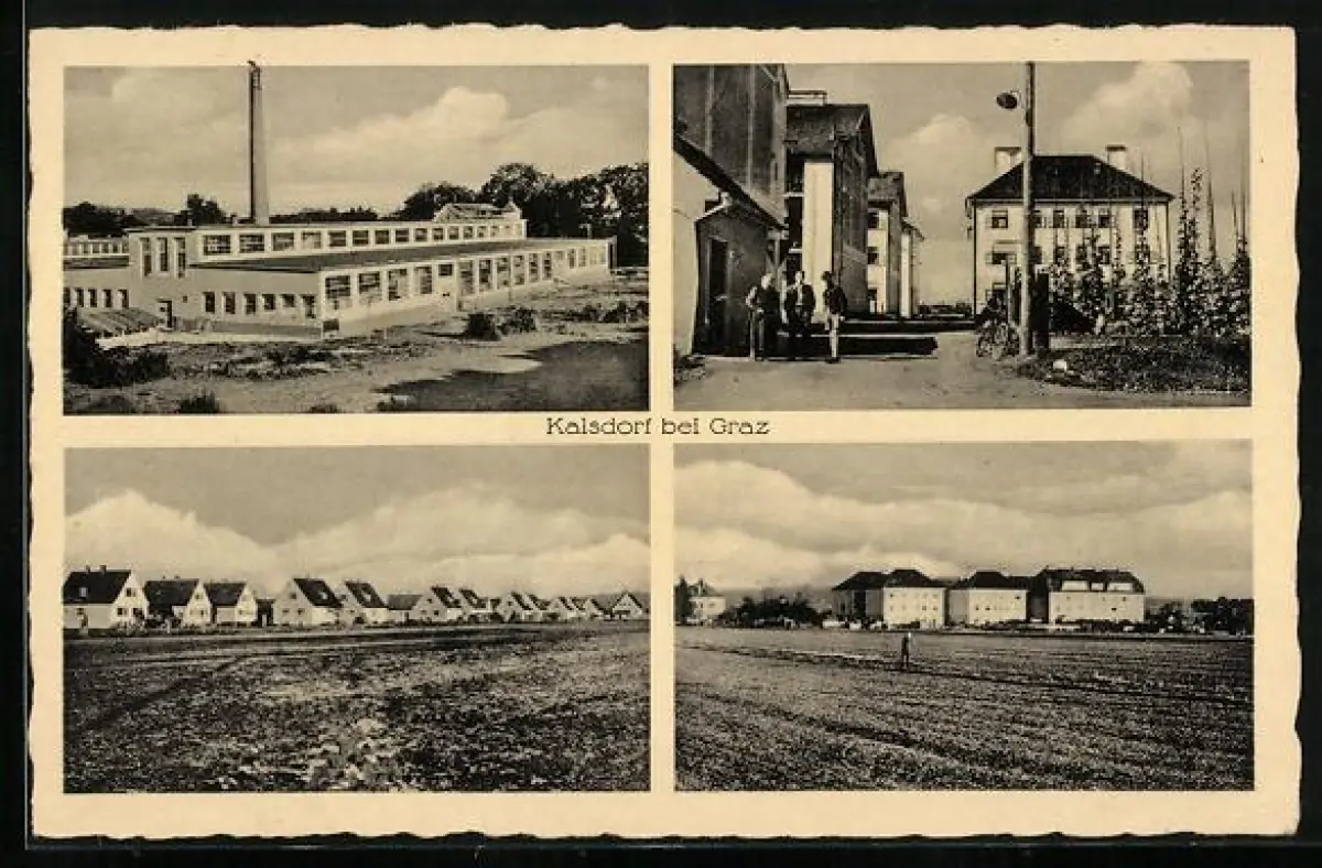AK Kalsdorf bei Graz, Wohnsiedlung, Fabrik und Strassenpartie