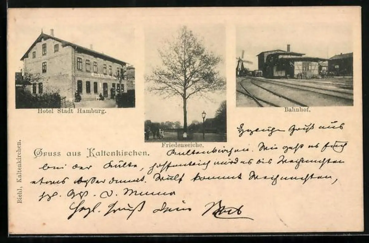 AK Kaltenkirchen, Hotel Stadt Hamburg, Friedenseiche, Bahnhof