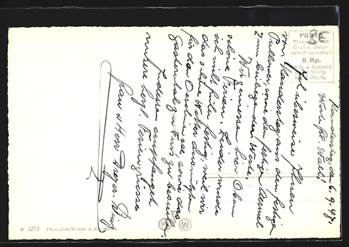 Personenbezogene Daten auf der Rückseite der Karte wurden durch blauen Textmarker unkenntlich gemacht. Die blauen Stellen sind auf die Vorderseite durchgeweicht und wirken sich negativ auf das Postkartenfoto aus