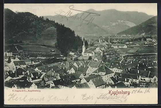 AK Kapfenberg, Ortsansicht mit Bergpanorama aus der Vogelschau