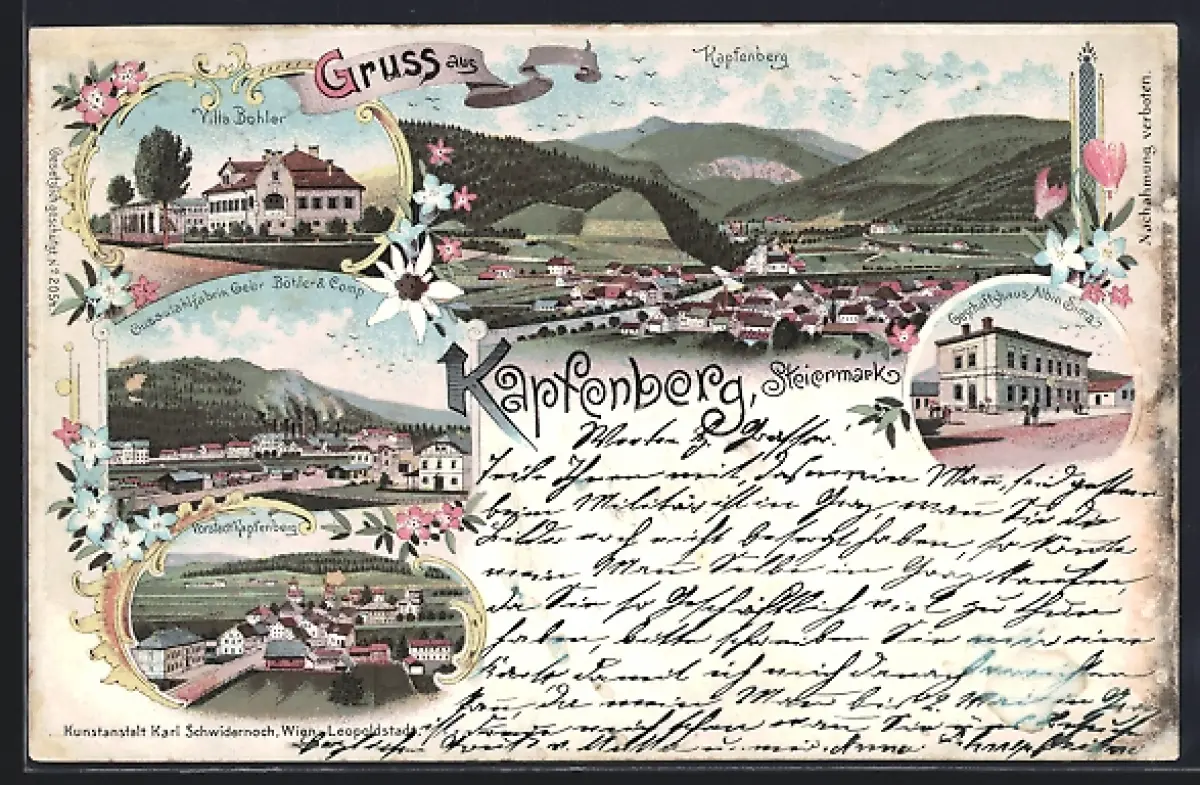 AK Kapfenberg /Steiermark, Geschäftshaus Albin Sima, Villa Böhler, Gessstahlfabrik Gebr. Böhler & Comp., Ortspanorama