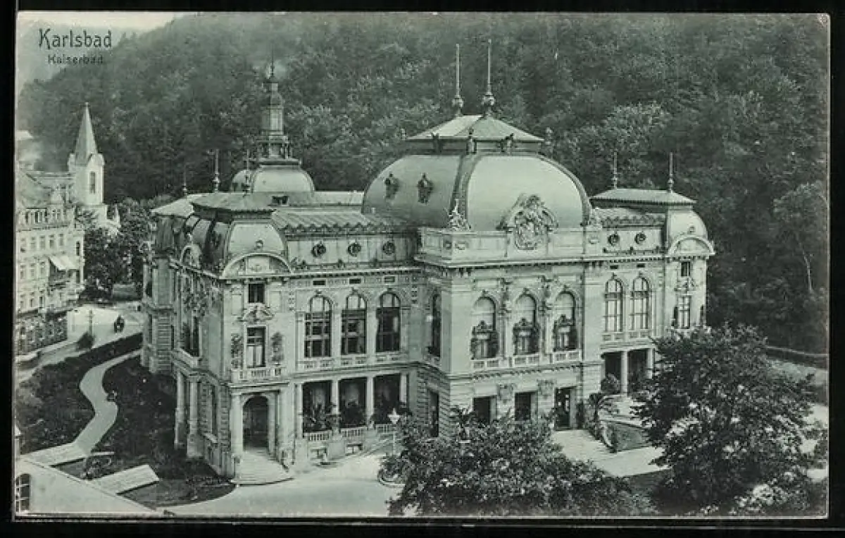 AK Karlsbad, Kaiserbad aus der Vogelschau
