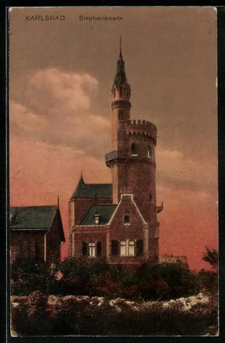 AK Karlsbad, Stephaniewarte in der Dämmerung