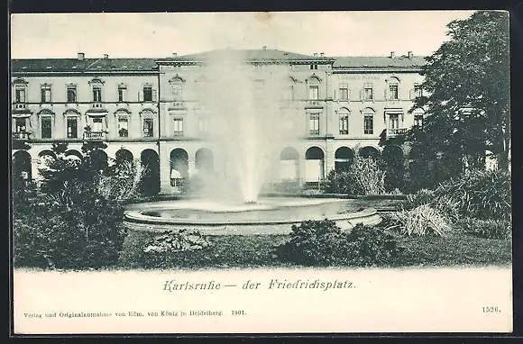 AK Karlsruhe, Der Friedrichsplatz mit Springbrunnen
