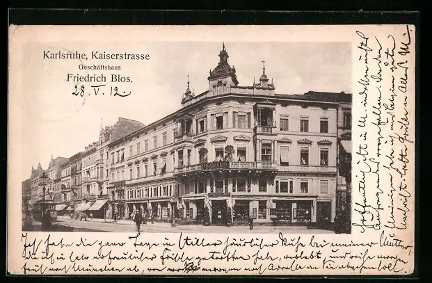 AK Karlsruhe, Kaiserstrasse mit Geschäftshaus Friedrich Blos