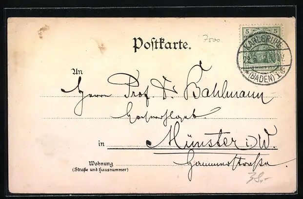 Personenbezogene Daten auf der Rückseite der Karte wurden durch blauen Textmarker unkenntlich gemacht. Die blauen Stellen sind auf die Vorderseite durchgeweicht und wirken sich negativ auf das Postkartenfoto aus