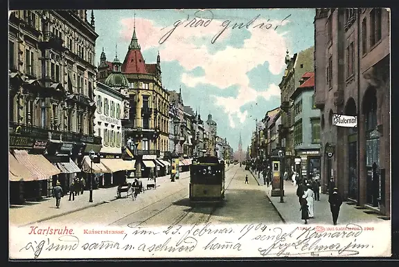 AK Karlsruhe, Kaiserstrasse mit Strassenbahn und Geschäften