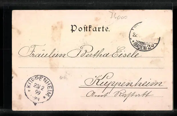 alte Ansichtskarte, gelaufen 1899, Briefmarke tw. entfernt, Eckknick li. unten, rückseitig Oberflächenschaden, guter Zustand