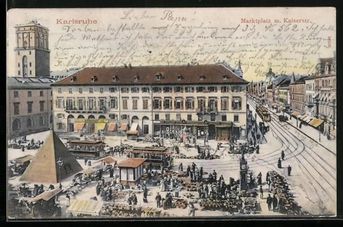 AK Karlsruhe, Marktplatz mit Kaiserstrasse und Strassenbahn