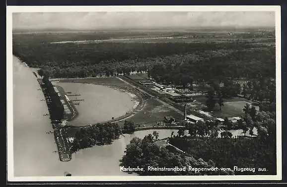 AK Karlsruhe, Rheinstrandbad Rappenwört vom Flugzeug aus
