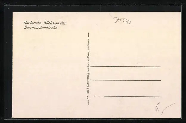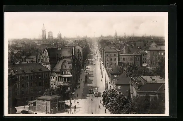 AK Karlsruhe, Strassenpartie mit Strassenbahn von der Bernharduskirche aus gesehen