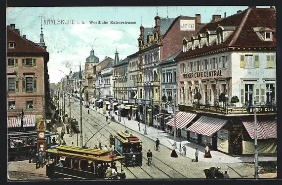 AK Karlsruhe, Westliche Kaiserstrasse mit Strassenbahn & Wiener Café Central