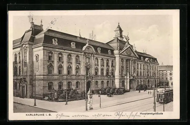 AK Karlsruhe i. B., Hauptpostgebäude mit Strassenbahn