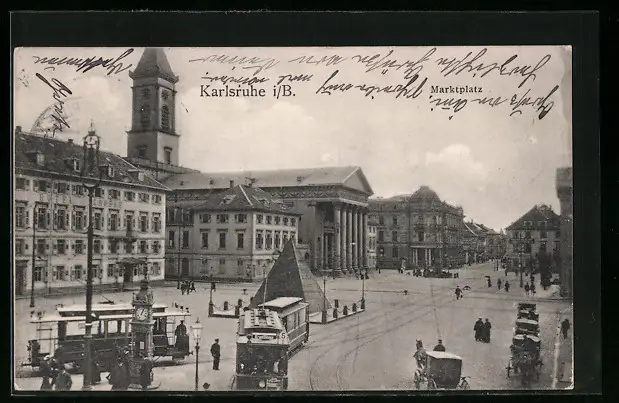 AK Karlsruhe i. B., Marktplatz mit Strassenbahnen