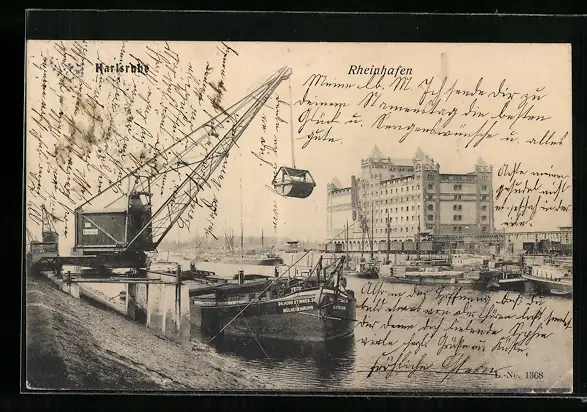 AK Karlsruhe i. B., Rheinhafen, Löschen eines Frachtschiffes