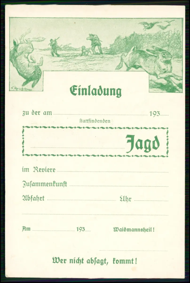 AK Karte - Einladung zu einer Jagd - die in den 1930er Jahren ausgestellt wurde