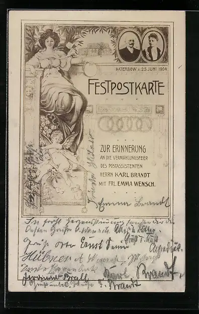 AK Katerbow, Festpostkare zur Vermählung des Postassistenten Karl Brandt und Frl. Emma Wensch 1904