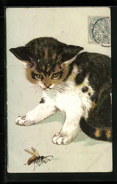 AK Katze blickt auf eine Wespe