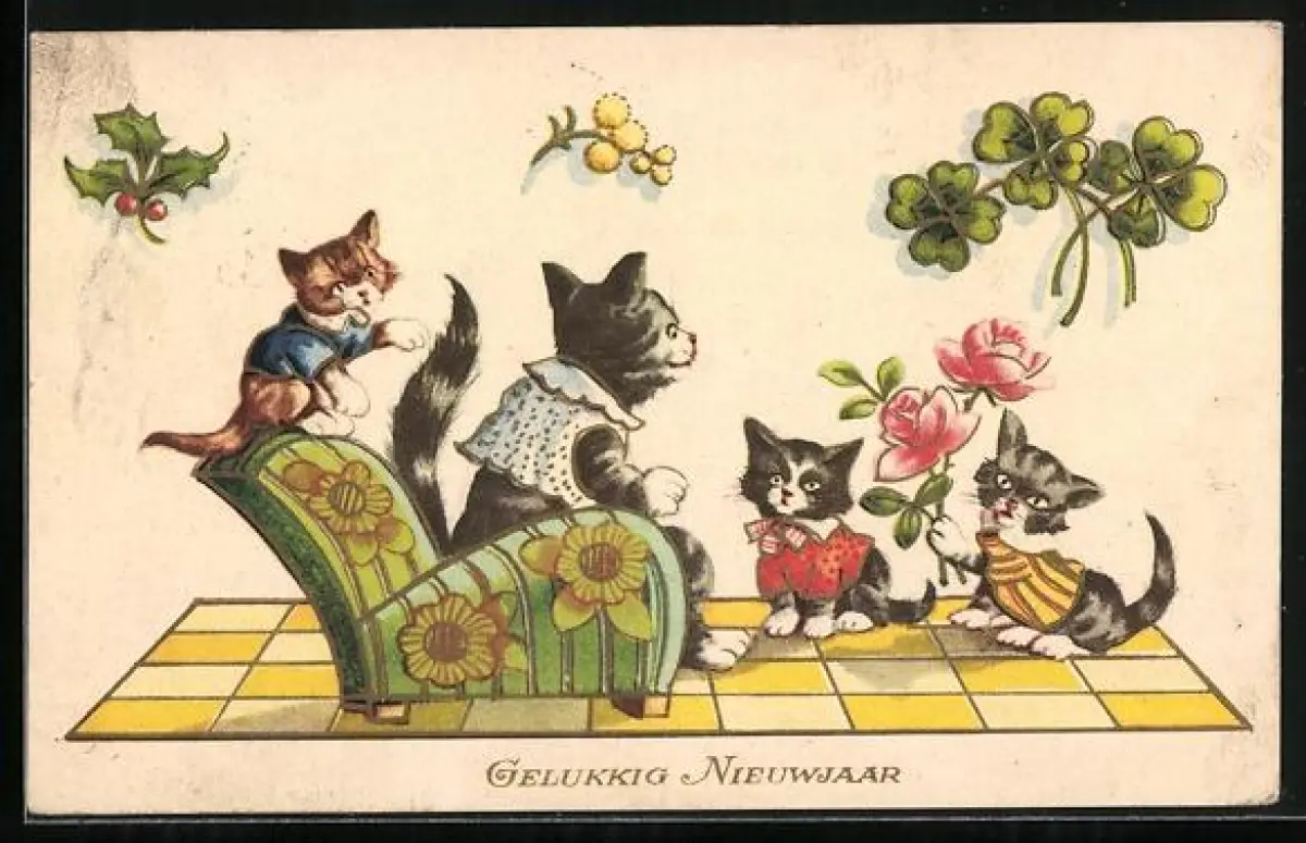 AK Katze im Sessel mit Katzenkindern, Neujahrsgruss, vermenschlichte Tiere