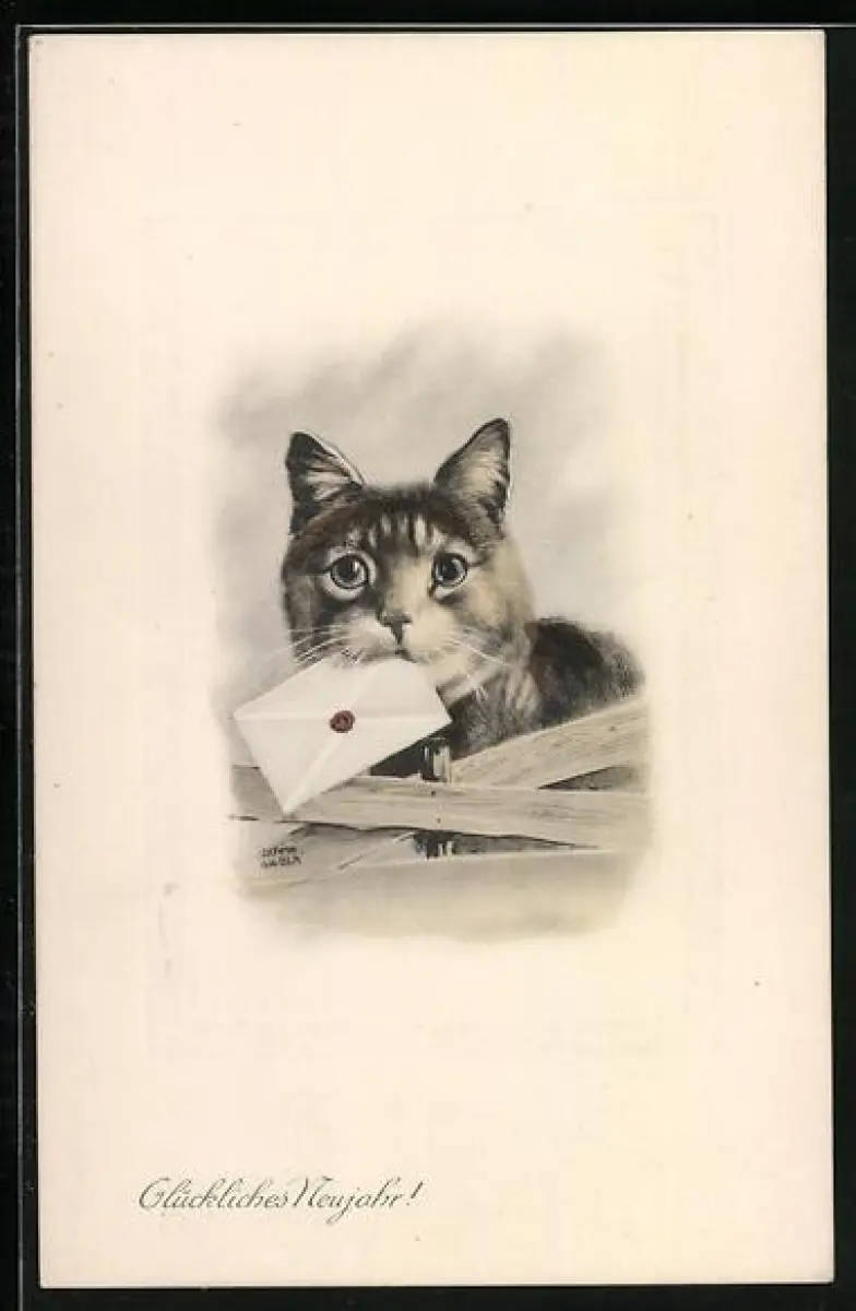 AK Katze mit versiegeltem Brief, Neujahrsgruss