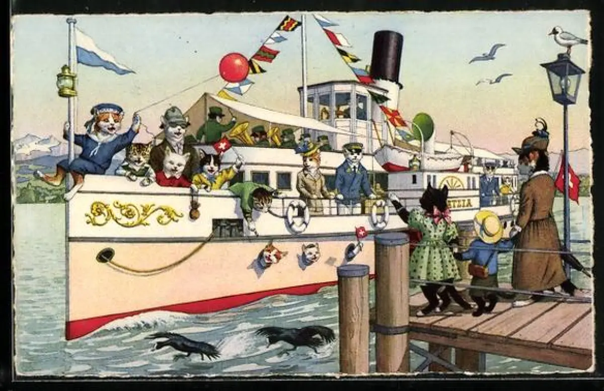 AK Katzen bei einer lustigen Dampferfahrt, vermenschlichte Tiere