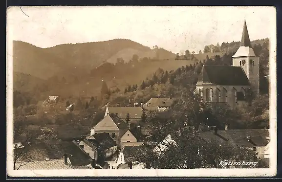 AK Kaumberg, Teilansicht mit Kirche aus der Vogelschau