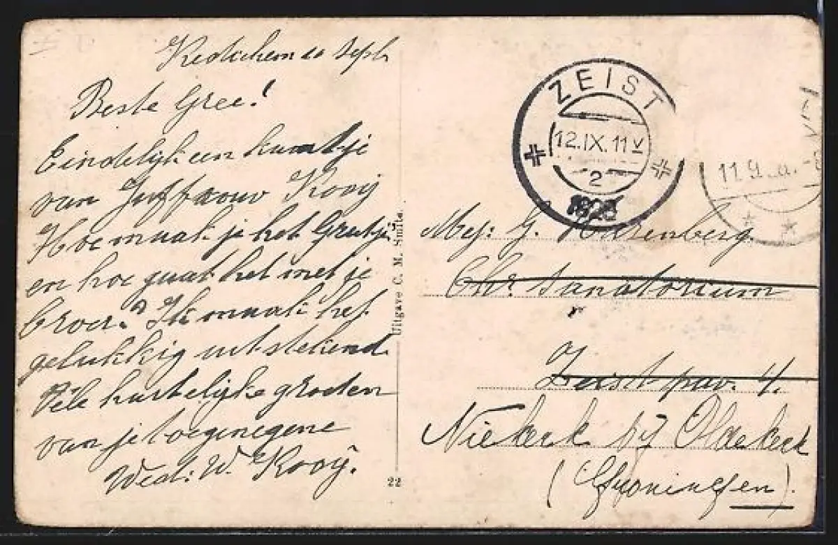 alte Ansichtskarte, gelaufen 1911, Briefmarke entfernt, rückseitig Oberflächenschaden, Eckknick li. oben, guter Zustand