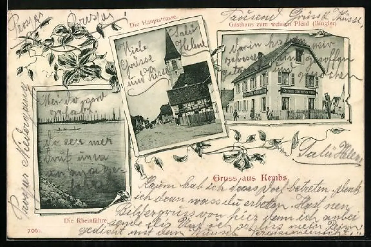 AK Kembs, Gasthaus zum weissen Pferd, Bes. Bingler, Hauptstrasse und Rheinfähre