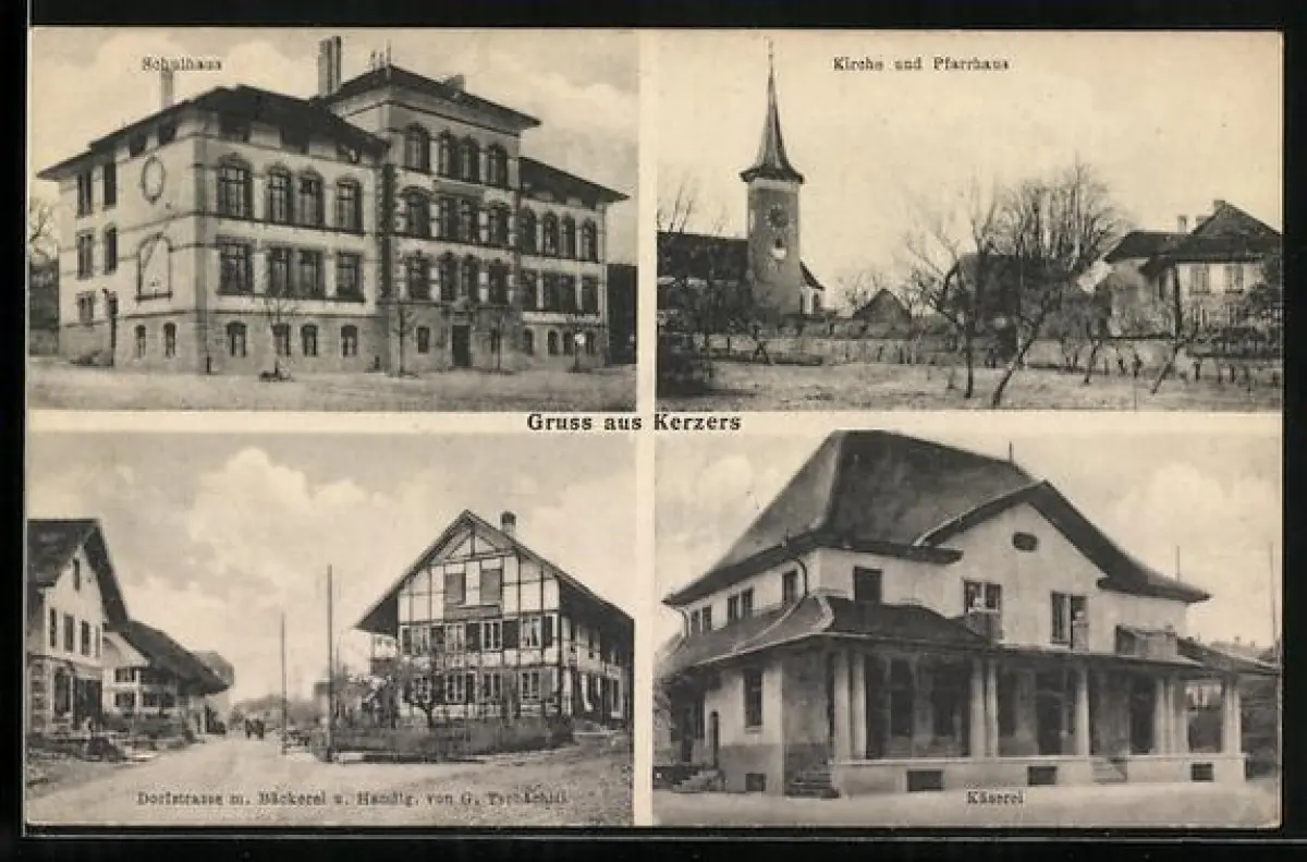 AK Kerzers, Bäckerei u. Handlung v. G. Tschächtli, Dorfstrasse, Käserei