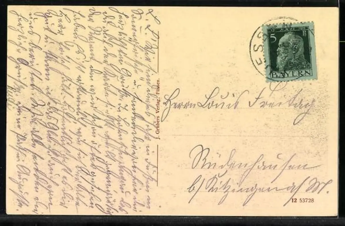 Personenbezogene Daten auf der Rückseite der Karte wurden durch blauen Textmarker unkenntlich gemacht. Die blauen Stellen sind auf die Vorderseite durchgeweicht und wirken sich negativ auf das Postkartenfoto aus