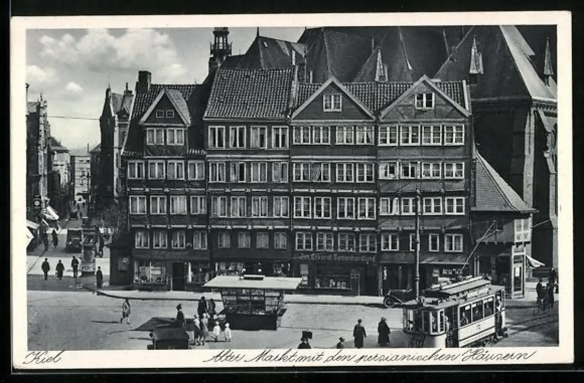 AK Kiel, Alter Markt mit den persianischen Häusern, Strassenbahn unterwegs