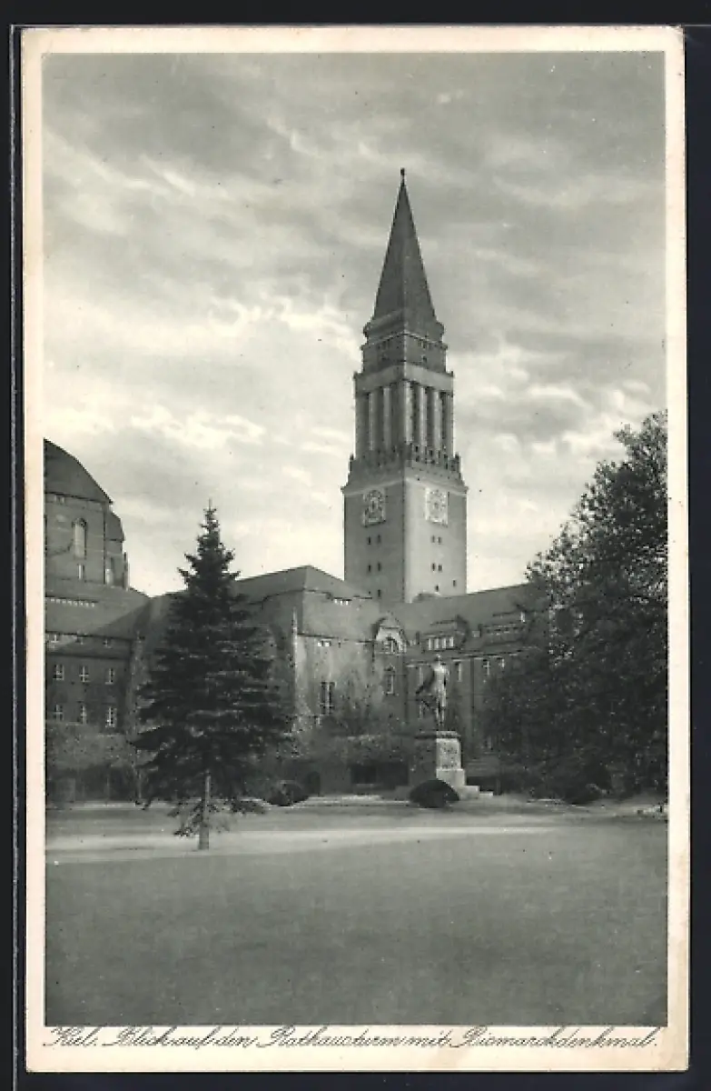 AK Kiel, Rathausturm mit Bismarckdenkmal