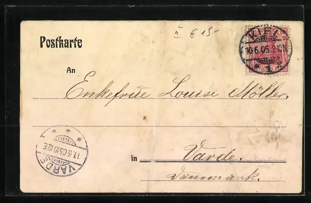 alte Ansichtskarte, gelaufen 1905, Oberflächenschaden re. unten, Bugspur vertikal mitte u. li., guter Zustand