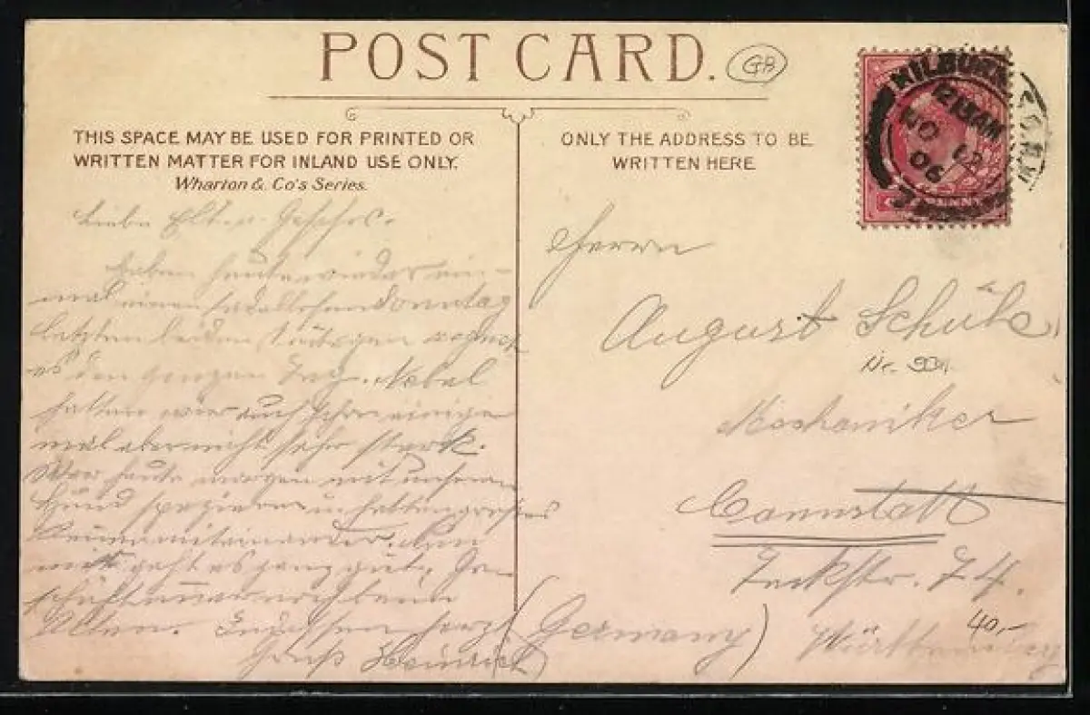 alte Ansichtskarte, gelaufen 1906, Stempelspur, Eckknicke li. unten und re. oben, guter Zustand