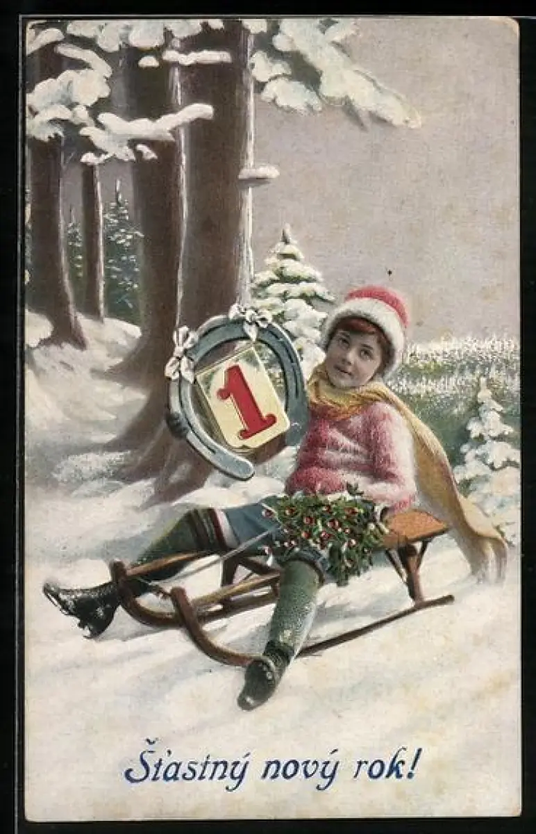 AK Kind auf einem Schlitten mit Hufeisen und Mistelzweig